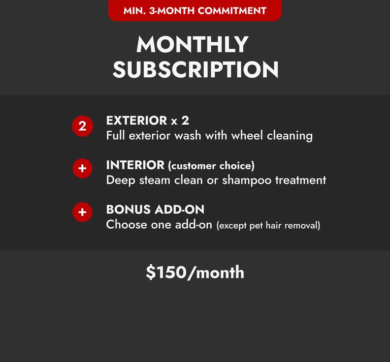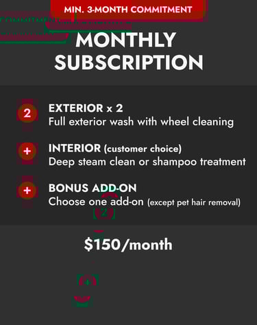 Join our monthly subscription and save money on your detailing. Members get priority service and a spotless car every month.