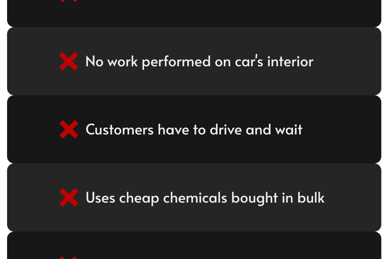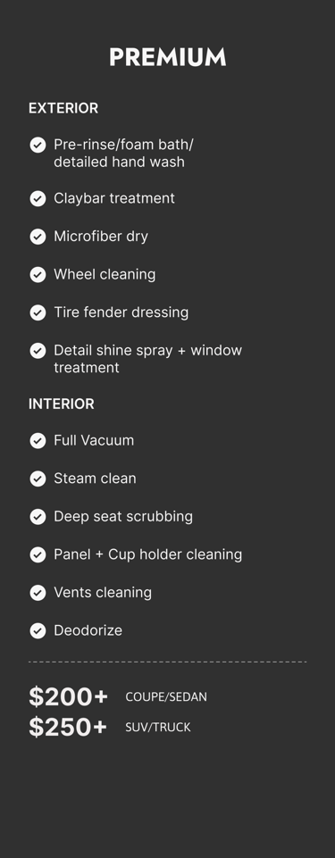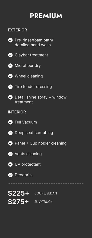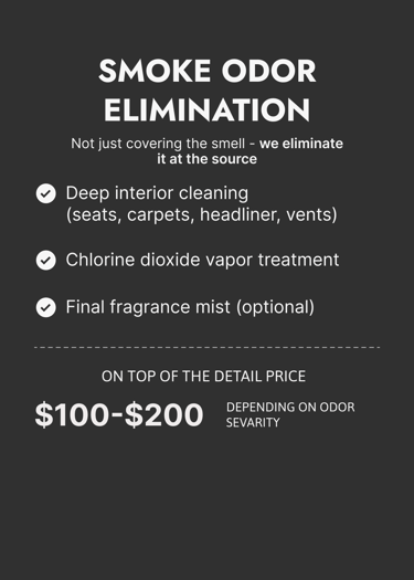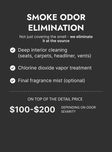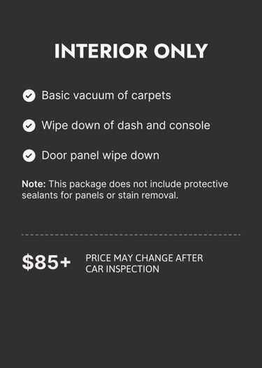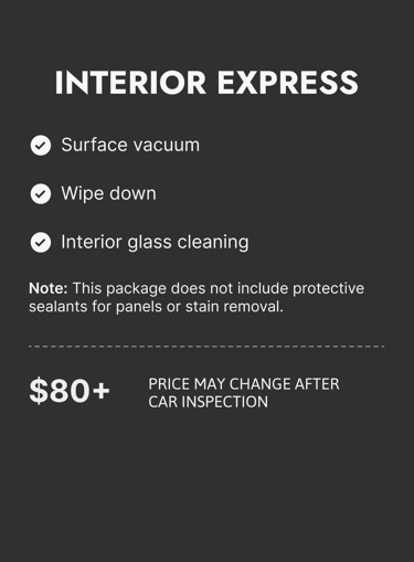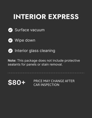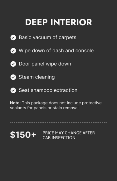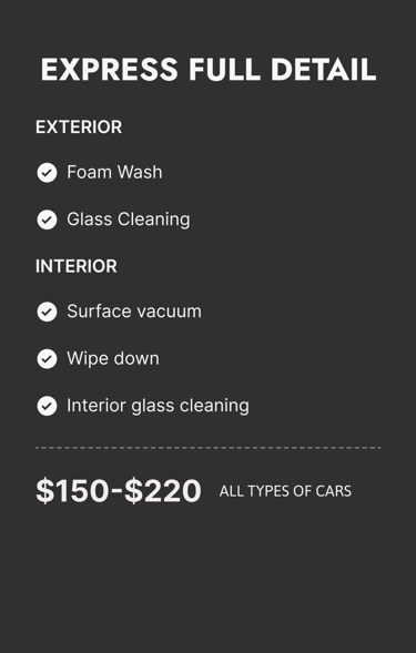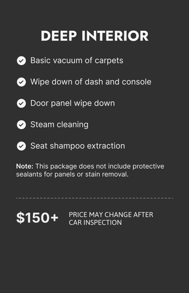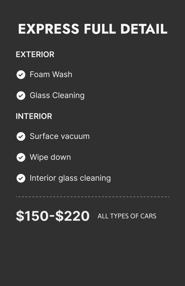 Car detailing prices may vary depending on the condition of your vehicle. Final pricing is subject to change upon visual inspection.