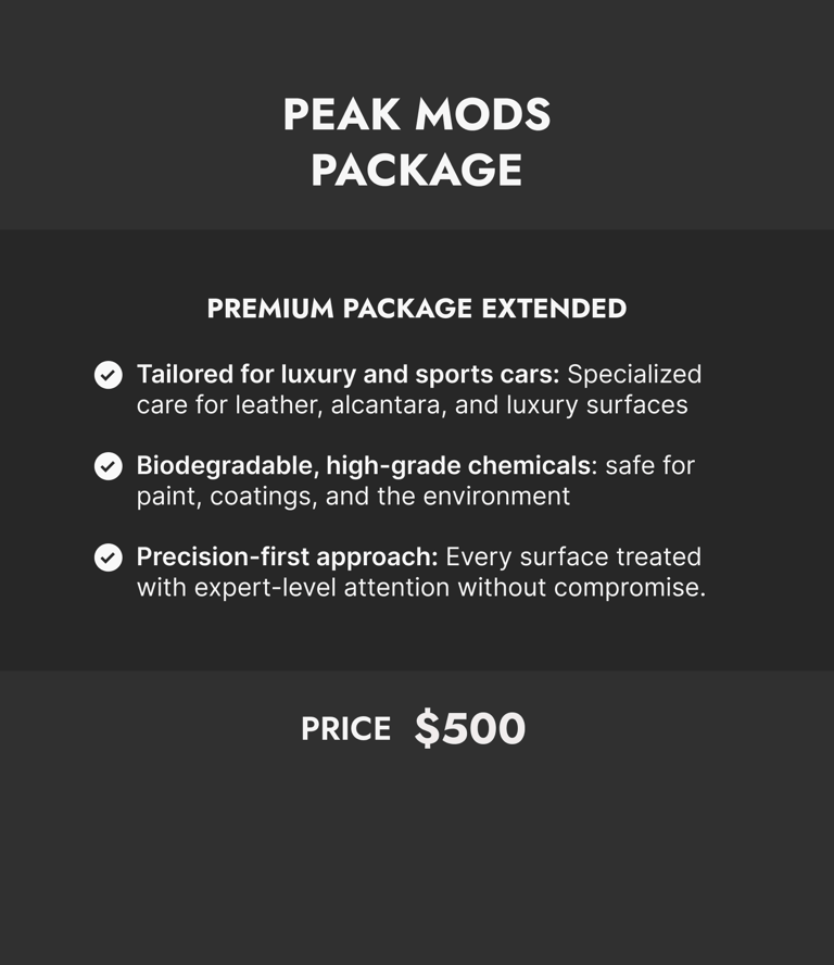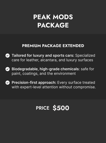 Designed exclusively for Peak Mods clients, this package ensures maximum protection, flawless aesthetics, and a premium experience that matches the luxury and exclusivity of your vehicle. It delivers the highest level of care using premium products and specialist techniques that protect your investment.