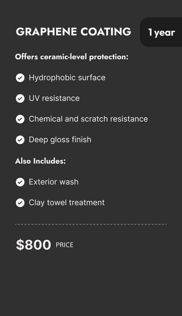 Ceramic coatings can cost up to $2800. Our graphene solution offers the same high-end protection for a fraction of the price. It’s lighter, stronger, and more flexible, forming a durable shield against water spots, scratches, and UV damage. Graphene boosts gloss, keeps surfaces cleaner longer, and adds deep, mirror-like clarity - all without the premium price tag.