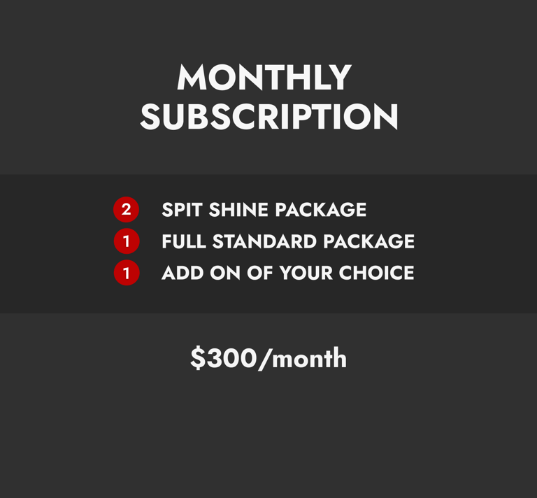 Join our monthly subscription and keep your car looking brand new all year long. Members get priority service and a spotless car every month.